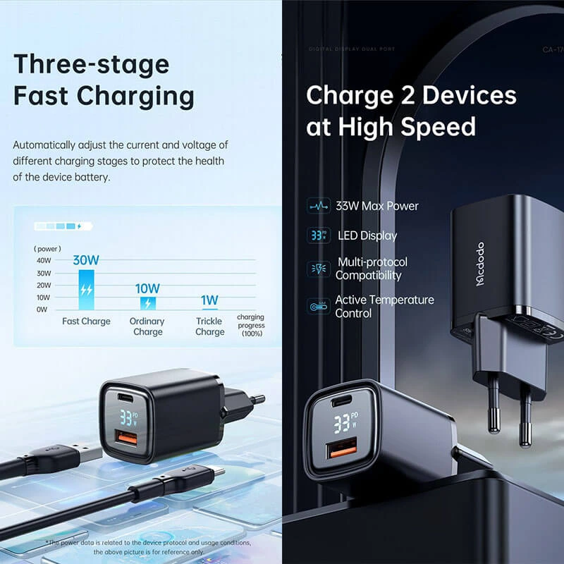 شارژر McDodo CH-1701 یک شارژر دیواری حرفهای با دو پورت USB-A و USB-C و توان خروجی ۳۳ وات است. این شارژر با پشتیبانی از فناوریهای Power Delivery (PD) و Quick Charge (QC) امکان شارژ سریع و ایمن گوشیها، تبلتها و سایر دستگاهها را فراهم میکند. طراحی جمعوجور و سبک آن استفاده در خانه، محل کار و سفر را آسان میکند.